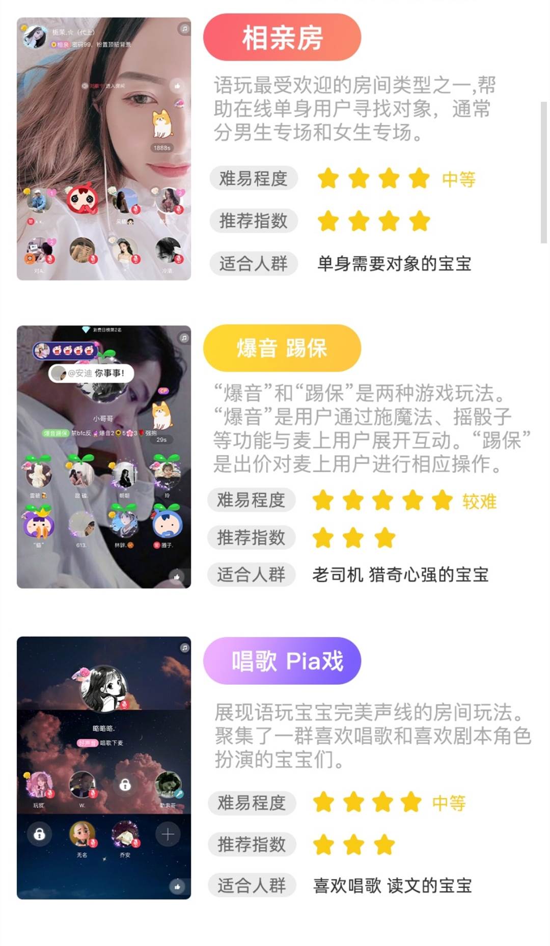 在语玩有3种房间类型N种玩法: