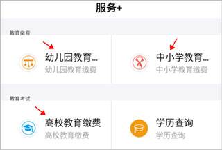 1、打开软件后,在“服务+”界面,选择缴费类型,例如:幼儿园、中小学、高校教育等。