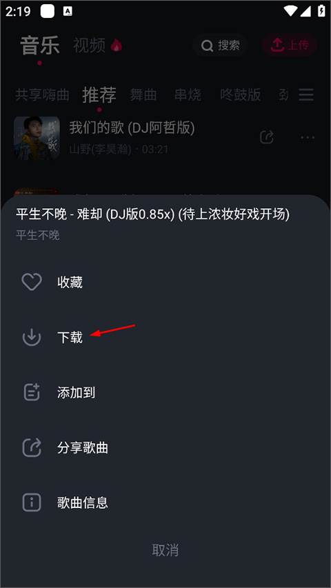 2、打开歌曲功能栏,用户可收菜或分享歌曲,点击下载按钮;