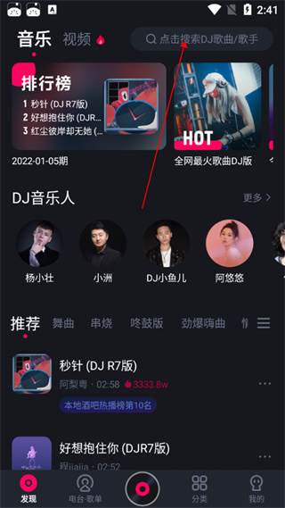 1、用户打开酷狗dj手机版,进入发现页面,在该页面中用户可了解排行榜、DJ音乐人、推荐歌曲等,点击列表中需要下载的歌曲;