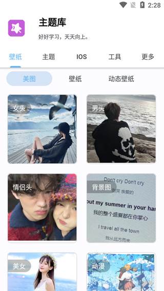 1、首先打开主题库app,点开壁纸,用户可以设置各种头像,如女头、男头、背景图、动漫等;