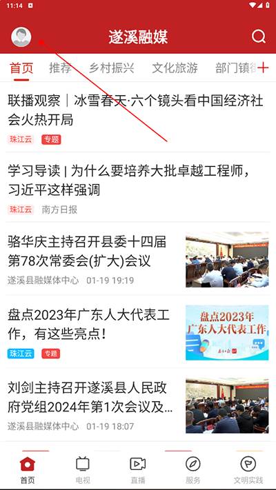 1、下载后打开进入遂溪融媒app,在首页左上方点击【我的】;