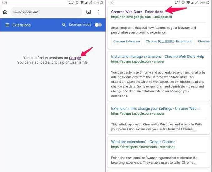 在Kiwi浏览器中访问Chrome Web Store,搜索插件名称进行安装即可,网址是:https://chrome.google.com/webstore/category/extensions