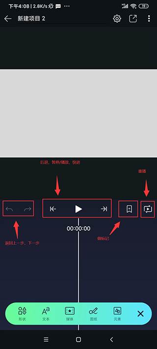 6、可以添加形状、文本、媒体(手机上的图片和音乐还有视频)、图纸、元素;