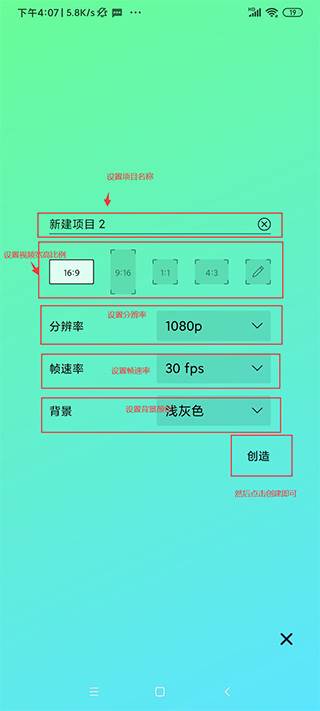 3、可以设置项目名称、宽高比例、分辨率、帧速率、背景颜色;