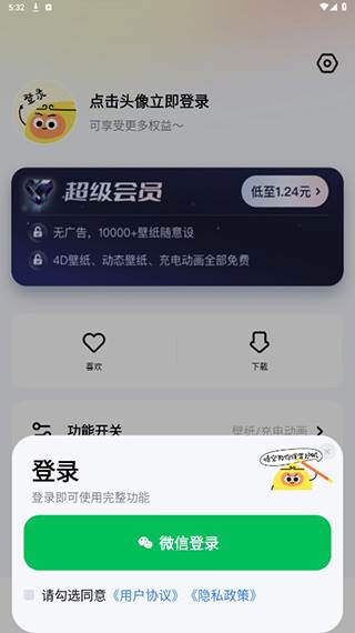 用户点击下方我的,可以进入个人中心,查看自己的信息,或者进行自制壁纸。