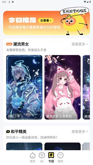 用户点击下方专题,有潮男潮女、和平精英、宫崎骏等专题壁纸可以选择。
