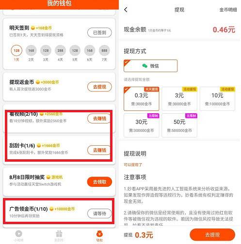 2、满0.3元就能提现,看视频、签到、走路、做任务都能赚金币,天天提现到微信红包