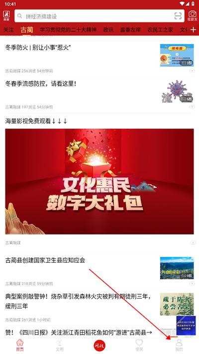 1、下载后打开进入古蔺融媒app首页,在右下角点击【我的】;