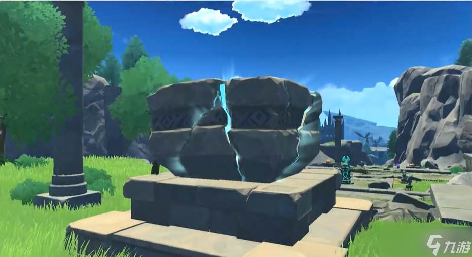 第四个风仙灵位于左侧风墙屏障内,需从附近断墙高处滑翔进入屏障内部,随后用风属性角色激活中央的机关解除风墙。若未携带风属性角色,可切换旅行者(风)使用元素战技触发。最后一个仙灵归位后,四根仙灵台柱会同时亮起,用风属性攻击激活中央方碑,秘境大门将从地下升起。