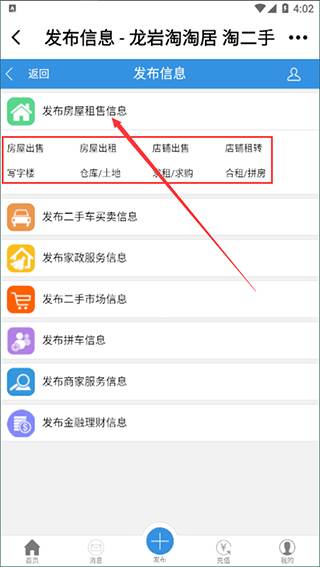5、最后选择你要发布的信息,如发布房屋租售信息--房屋出租,然后填写房屋的大致情况即可。
