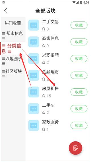3、然后在“全部板块”中找到分类信息--房屋租售;