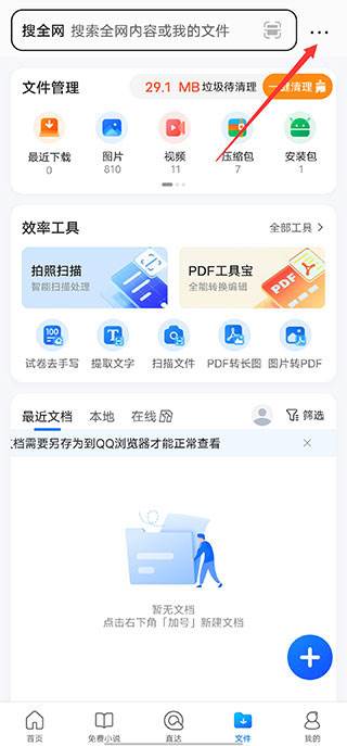 1、打开QQ浏览器,点击“文件”,再点击右上角的三个点。
