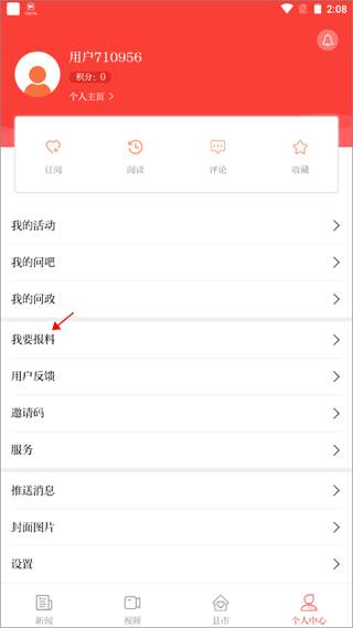 1、打开app并进入主界面,切换到【个人中心】界面,点击“我要报料”。