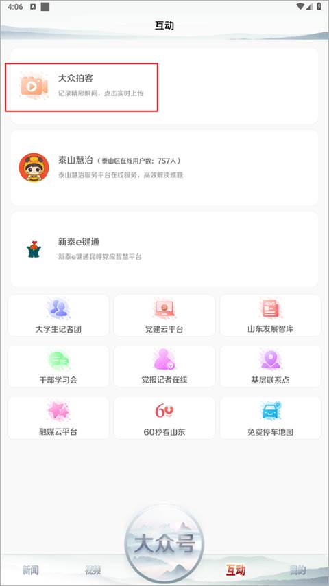 1、打开软件后,点击底部的“大众号”进到页面点击右上角的“入驻”
