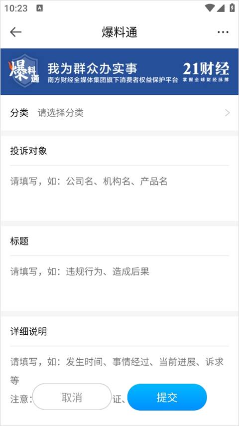 2、在“爆料通”界面选择“我要爆料”按钮。