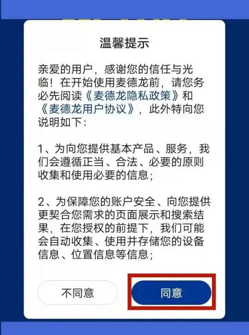 手机打开麦德龙app,阅读条款,点击同意,如图红色文本框: