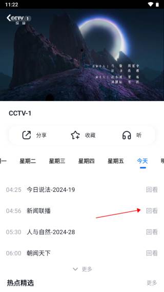 2、滑动选择日期及节目。点击回看(注:回看时间为一周,超过一周无法回看;只有部分节目可进行回看)
