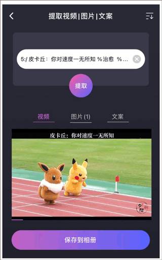 3、复制之后,再打开本款app,然后点击首页里面的提取视频|图片按钮,点击进入后,长按粘贴刚刚的链接,然后点提取就可以获取到无水印的视频/图片了。