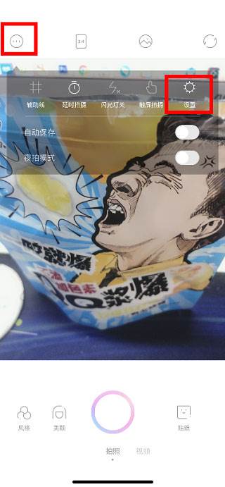 1、打开一甜相机app,然后点击左上角的上个点,会看到设置,直接点击进入。