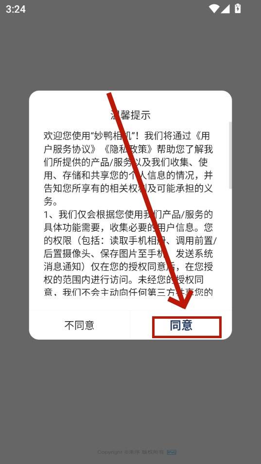 1、下载并安装 妙鸭相机App,打开应用后点击“同意”以接受服务条款和隐私政策。