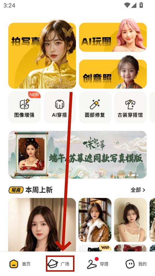 3、在广场页面中,找到并点击“制作创意照”按钮,开启您的创作之旅。