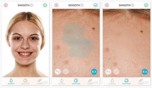 通过 SMOOTH 选项可以让皮肤变得光滑,也就是常说的磨皮。操作方法十分简单,在需要的区域涂抹即可。你可以通过下方的工具条切换 SMOOTH 的强度,选择 SMOOTHER 时效果会更加明显。如果需要擦除,选择右边的橡皮擦即可。