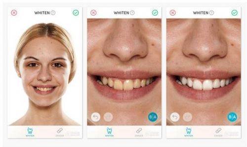 微笑时,一口泛黄的牙齿会让整体画面感大打折扣。WHITEN 选项可以让你在几秒钟内完成牙齿漂白。操作方法十分简单,只需要在牙齿表面涂抹即可。如下方的对比图所示,效果十分自然。