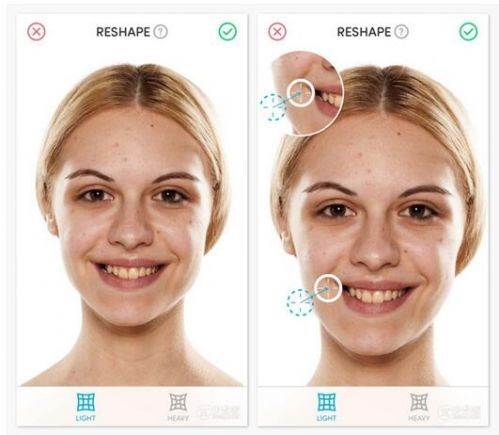 RESHAPE 可以让某一区域产生压缩或者拉伸变形。想把自己整成明星大众脸,只需要选择 liGHT,就可以把自己的下颌骨缩回去了。点选你需要变形的位置,将画面出现的蓝色指针拖动至你想要变形的方向即可。下方工具栏中的 HEAVY 可以让变形更加明显。