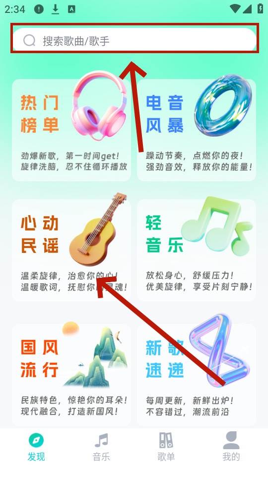 直接在上方搜索歌曲歌手,或者点击下方的榜单
