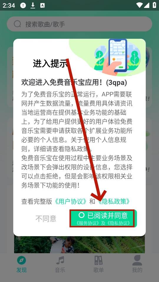 下载安装并打开免费音乐宝app,点击阅读并同意
