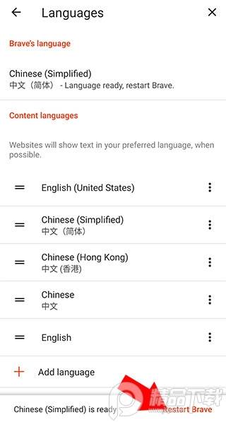 6、选择后,下方会弹出让你重启浏览器的通知,点击“Restrat Brave”即可,重新打开之后浏览器就是中文了