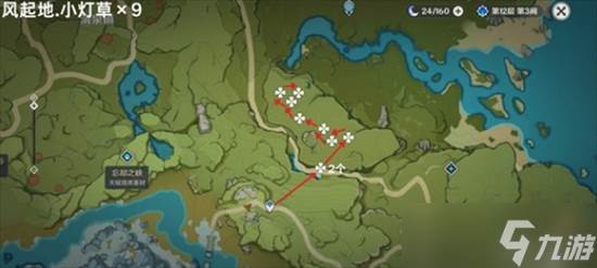 3、风起地东部区域,可以采集到六个小灯草,这个数量可能会有点少,位置如下图。
