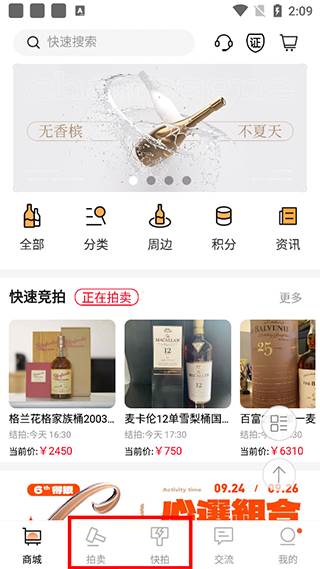 1、打开酒虫网app,点击首页下方的【拍卖】或是【快拍】参与拍卖;