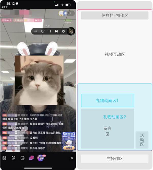 4、礼物动画区与留言区为与直播间粉丝互动的区域。