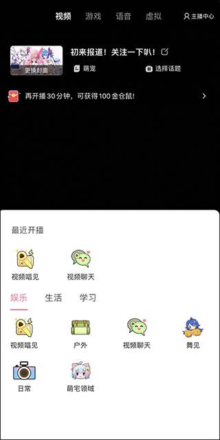 TAB栏选择开播模式,根据开播内容划分为视频、游戏、语音、虚拟开播。