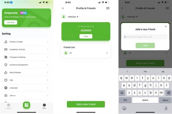 安装后,打开 Widgetable 应用程序并点击位于底部菜单中的更多,然后点击菜单中的个人资料和好友。接下来,点击屏幕底部的添加新朋友并输入他们的代码。