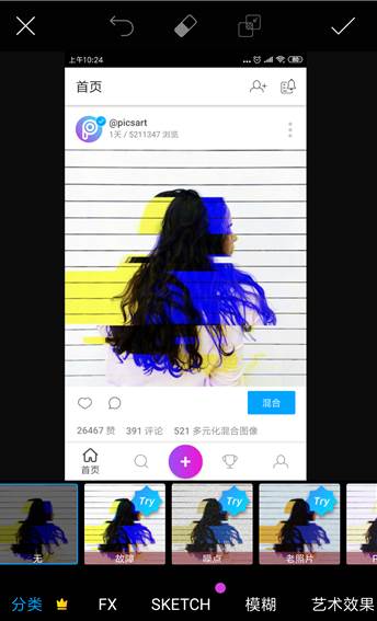 4、一系列滤镜可供选择,包括漫画、素描、水彩、含糊、蜡像、油画、失真和彩色飞溅等。