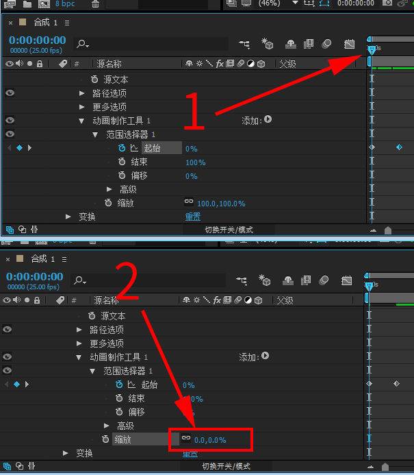 再把时间在拖到到最开始的位置,修改缩放为0即可;