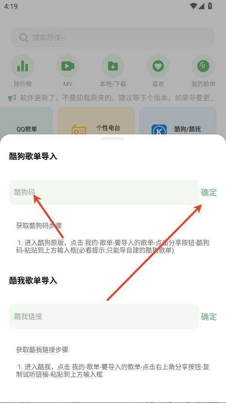 将酷狗的分享码输入到框内点击确定即可导入。