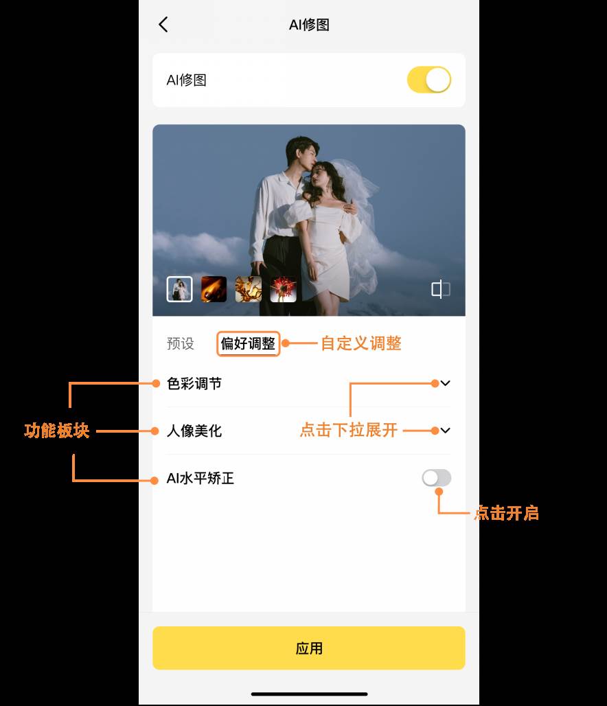 色彩:预设中可包含AI色彩风格及色彩调节板块色彩参数调整。