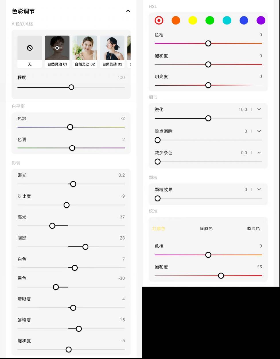 选用对应的风格,拖动风格上滑杆可对该风格程度进行调整,还可在选用AI色彩风格后进一步对具体色彩调节参数(白平衡、影调、HSL、细节、颗粒、校准)进行细化调整。