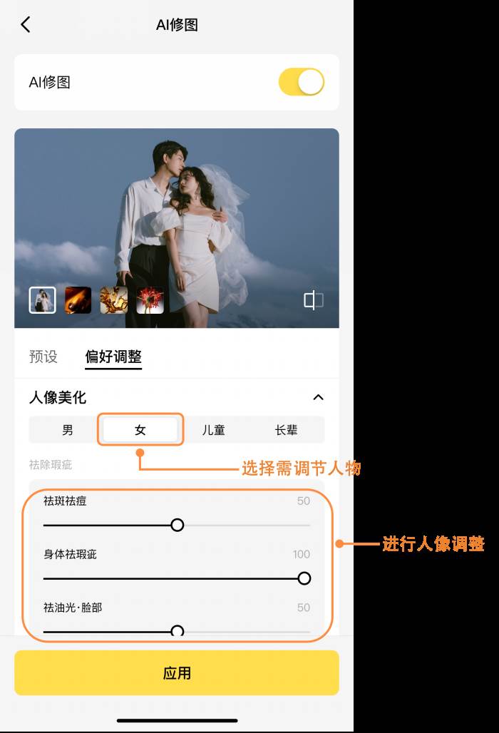 AI自动检测照片中的人物年龄、性别信息,通过AI的智能识别去区分不同人物(男、女、儿童、长辈)进行具体人像程度调节(祛除瑕疵、皮肤调整、面部重塑、表情管理、牙齿美化、眼睛增强、妆容调整、头发调整、全身美型)