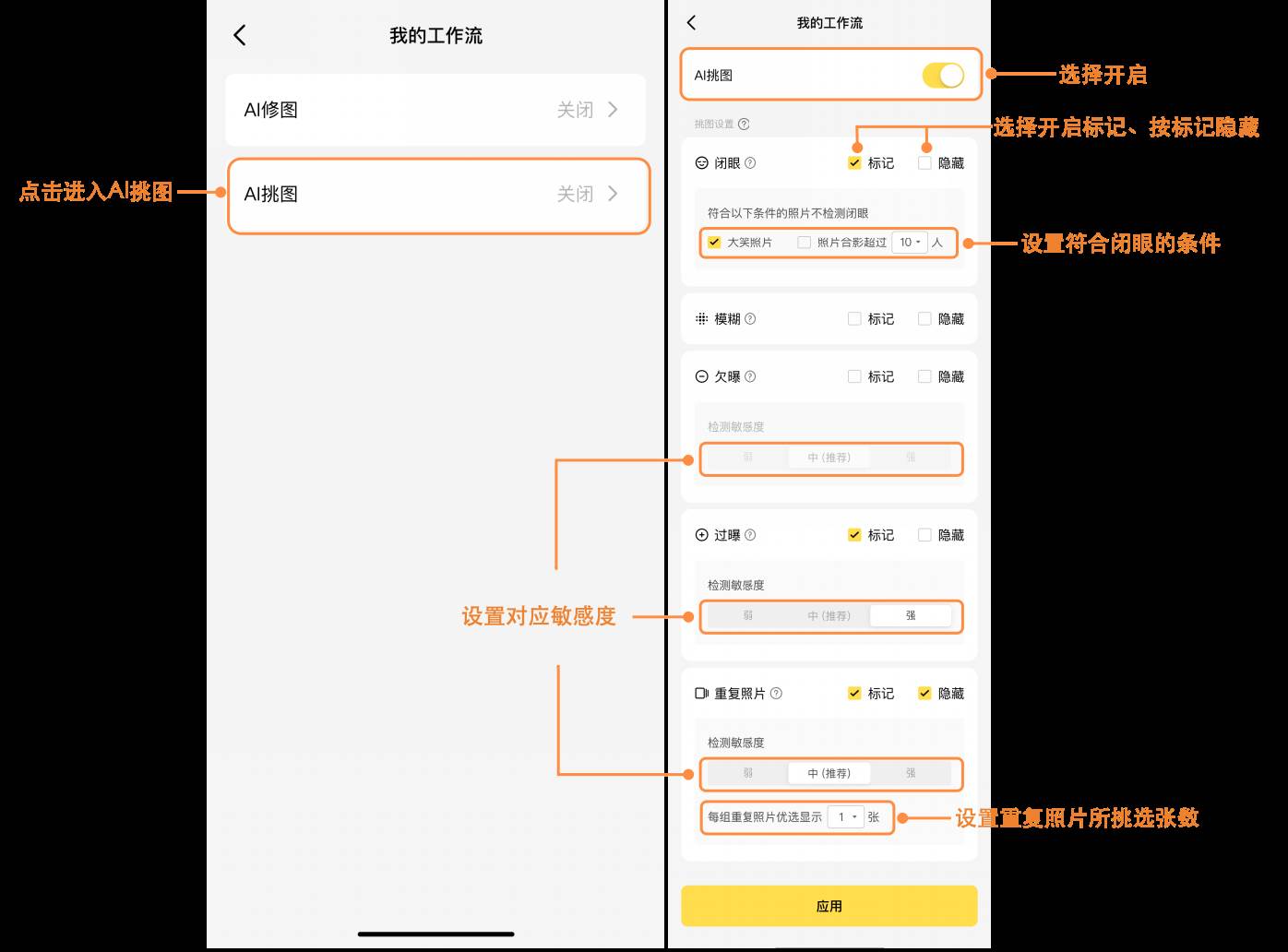 智能标记闭眼、模糊、过曝、欠爆、重复图片,并按标记隐藏、重复图片择优展示,真正解放双手