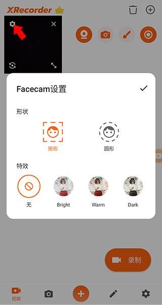 3、点击摄像头小窗后再点击左上角齿轮按钮即可设置小窗的形状以及滤镜,点击左下角按钮即可切换前/后置摄像头