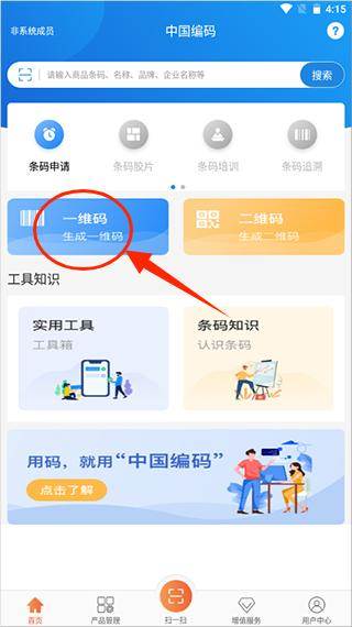 1、下载并打开中国编码app,进入主界面后点击“生成一维码”。