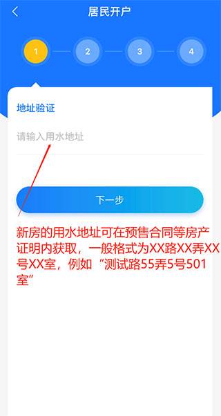 2、阅读办理须知后,点击确认,并进入地址验证界面,用户地址可以参照房产证明地址填写,填写用水地址后,点击下一步即可进入信息填写页