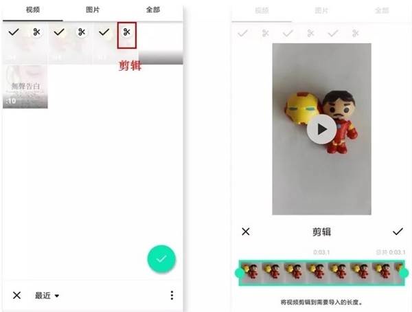 在主界面点击「视频」,即可找到本地视频内容。在这里点击所需要内容后,再一次点击「剪刀」图标,即可进行第一次的粗剪。剪辑完后,点击右下角的「打钩」符号,表示完成。