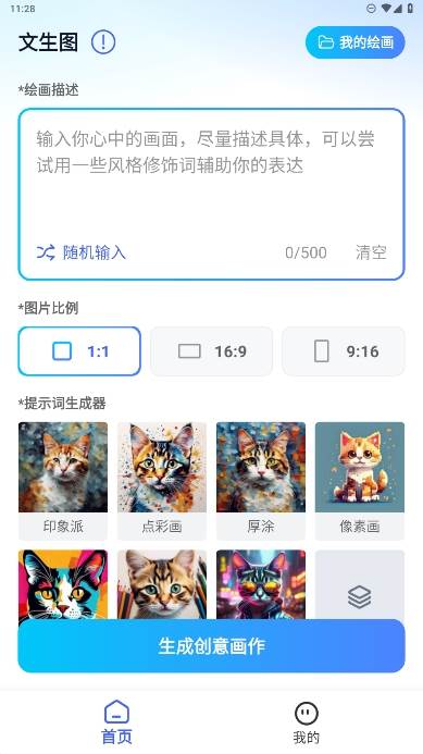 AI绘画助手是一款非常好用AI绘图工具,你只需要把自己的绘画想法描述出来,就能自动生成图画,还可以选择各种风格的图画,非常的实用,让绘画不再是难事,引领绘画新风尚,将你的想法变为现实,有需要的用户快下载试试吧。