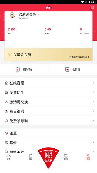 3、而在【会员码】页面,我们还能出示会员码、支付码等信息,完成扫码点餐、面对面支付等操作。